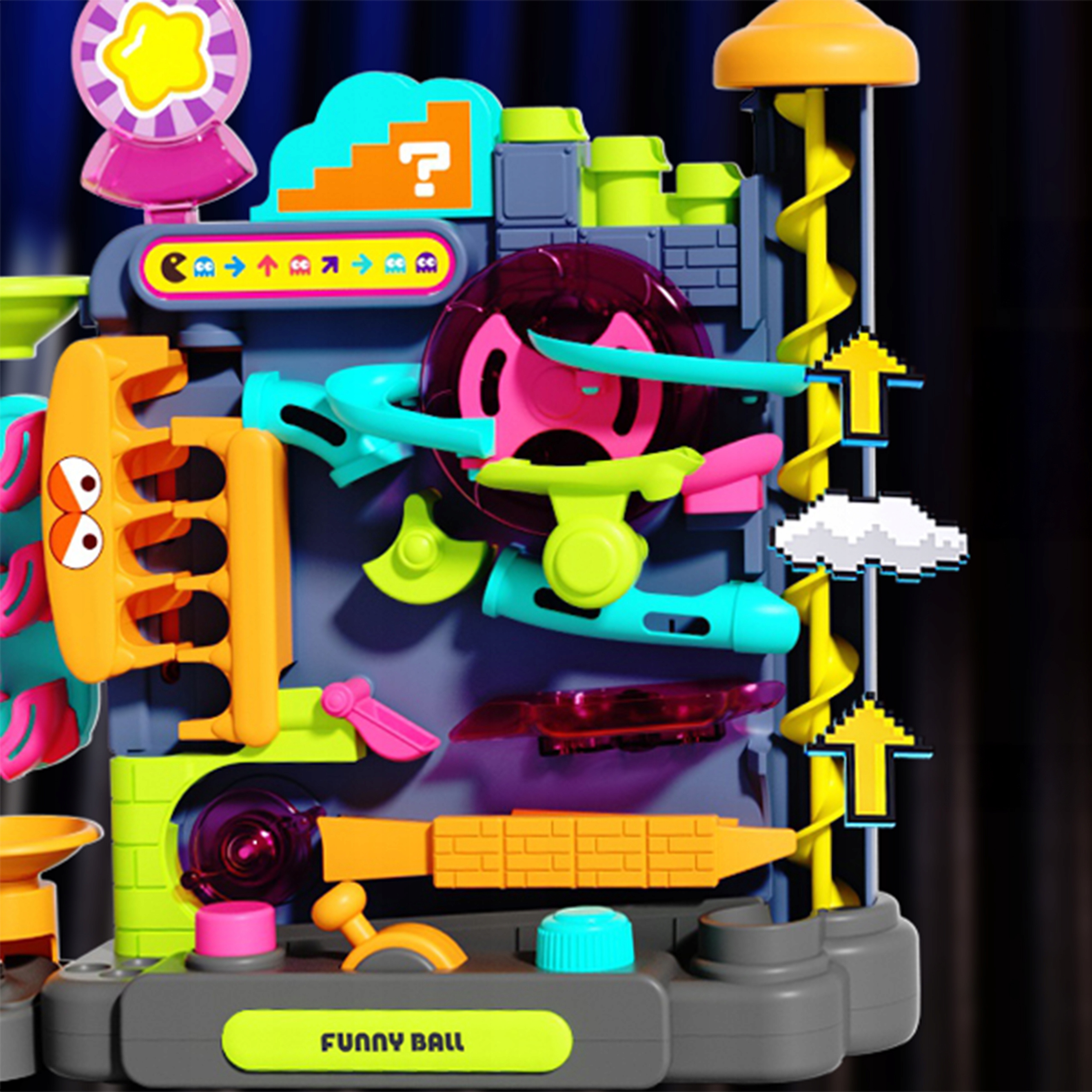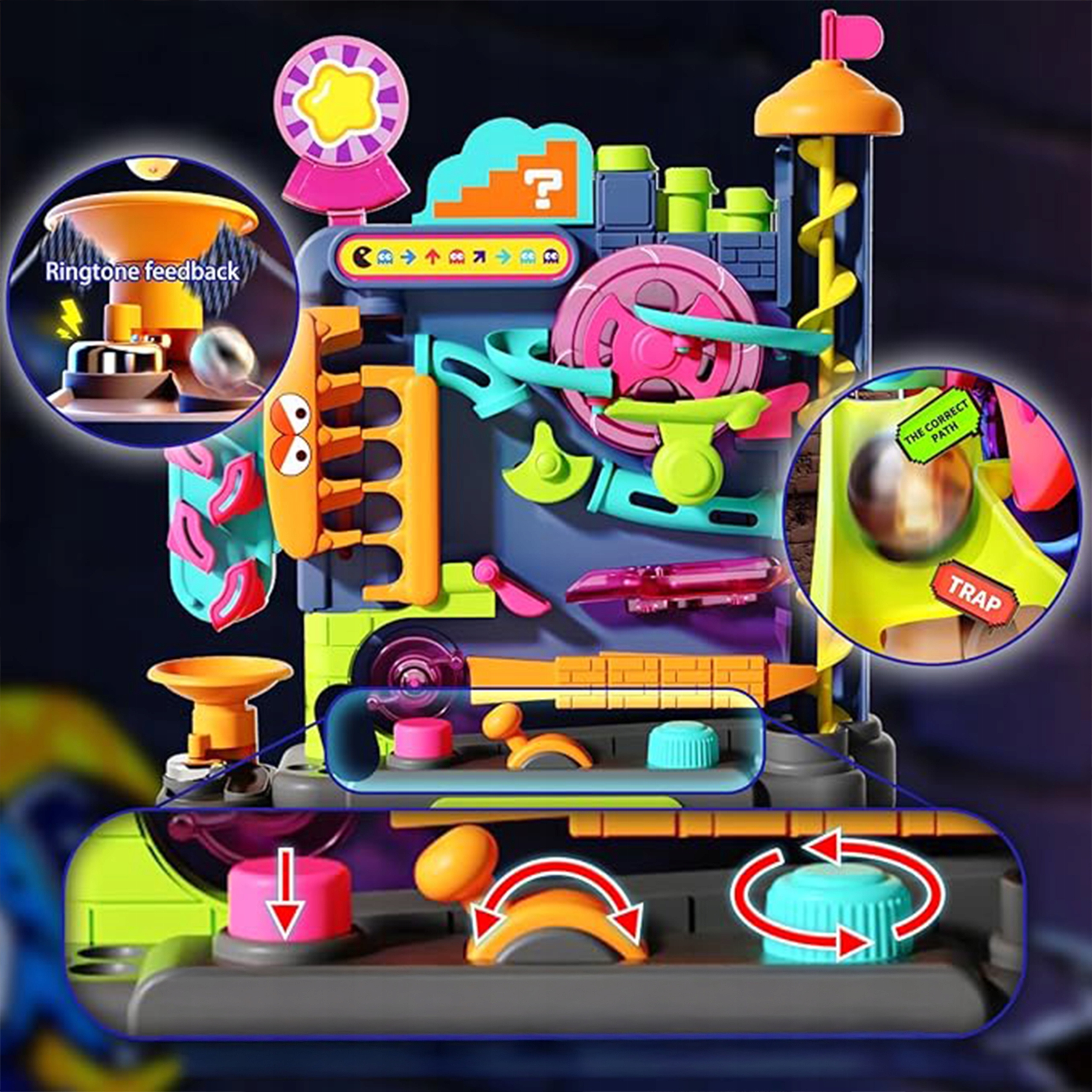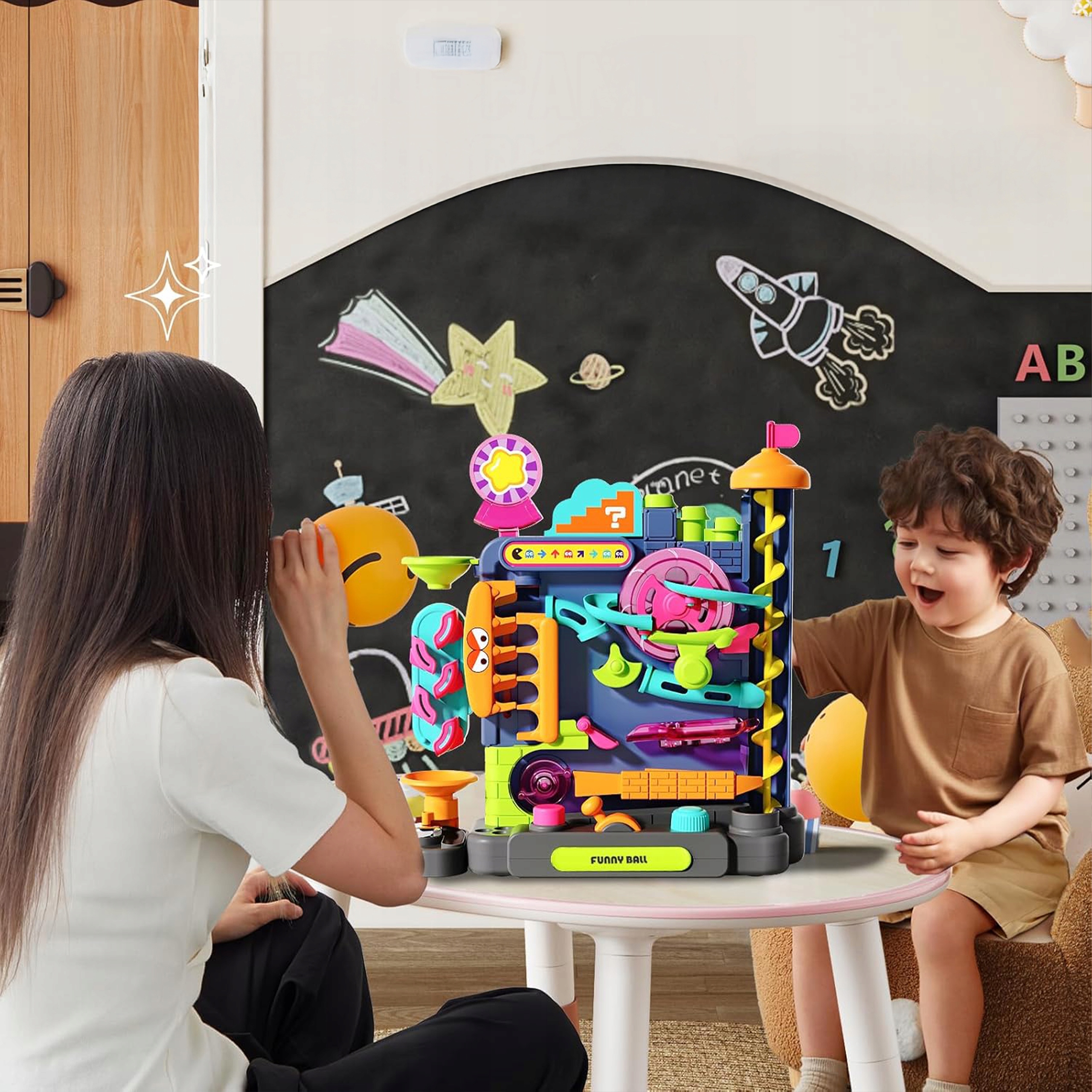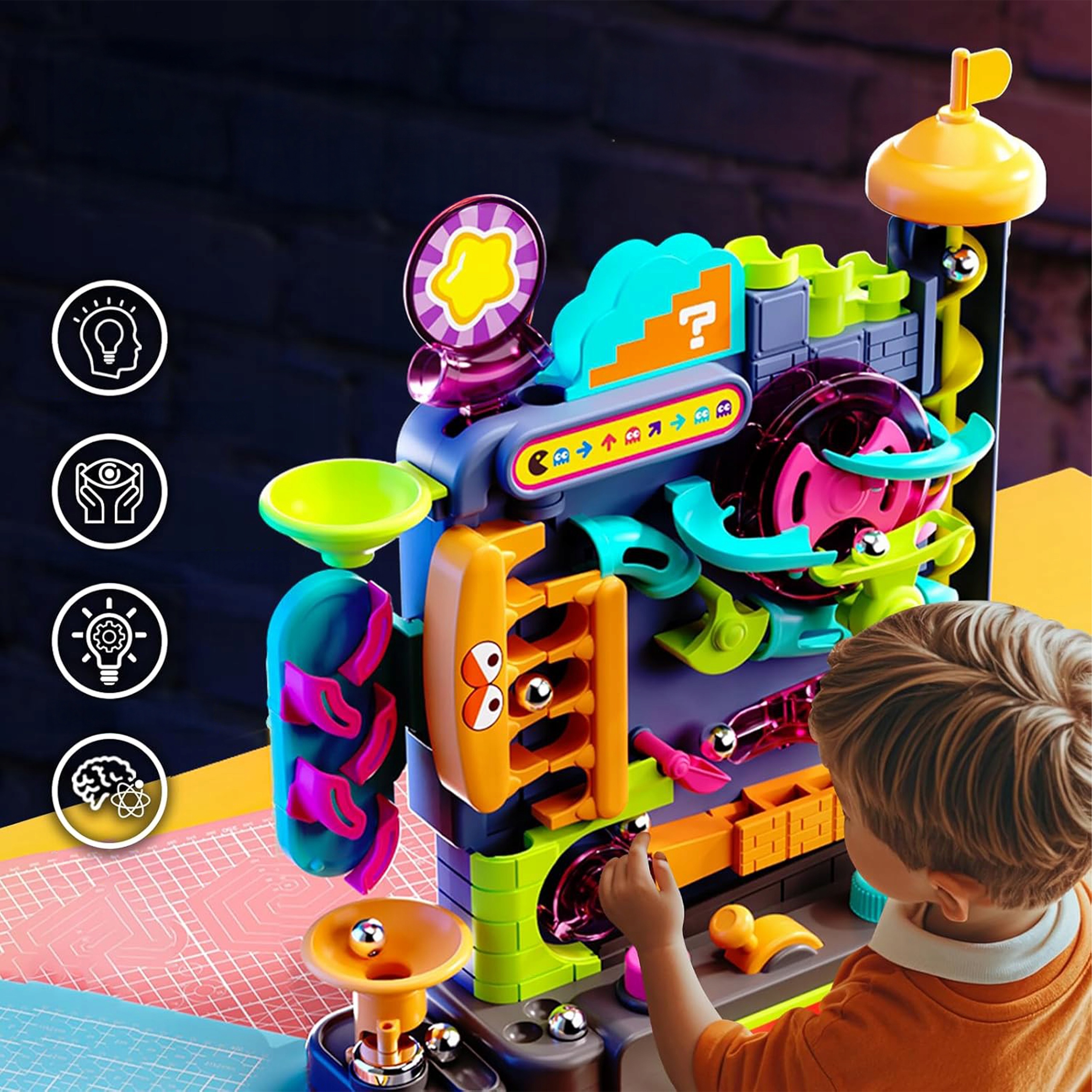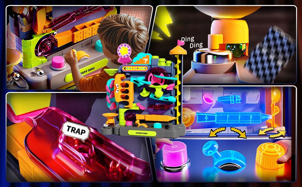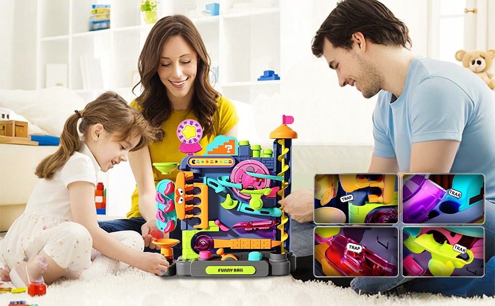 Kolorowe elementy 3D sprawiają, że zabawa staje się jeszcze ciekawsza. Dziecko obserwuje ruch kulek po spiralach, tunelach i zakrętach, rozwijając przy tym logiczne myślenie.