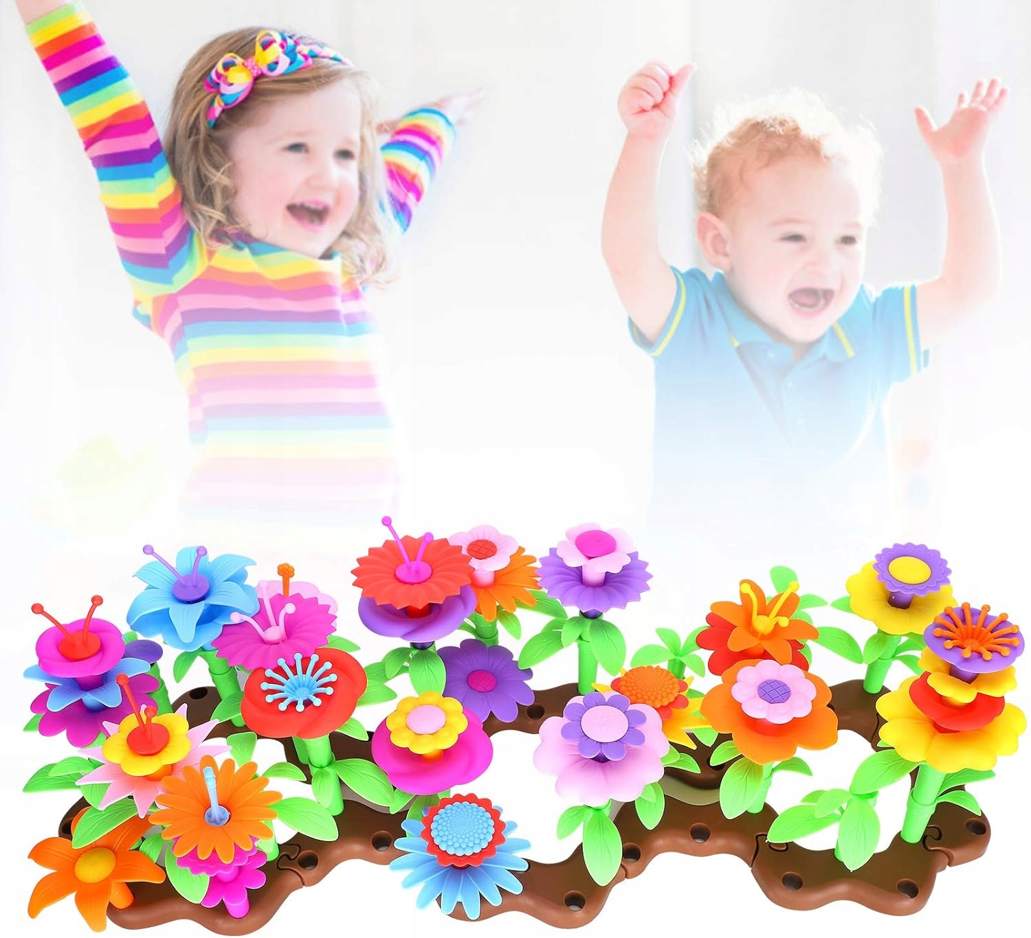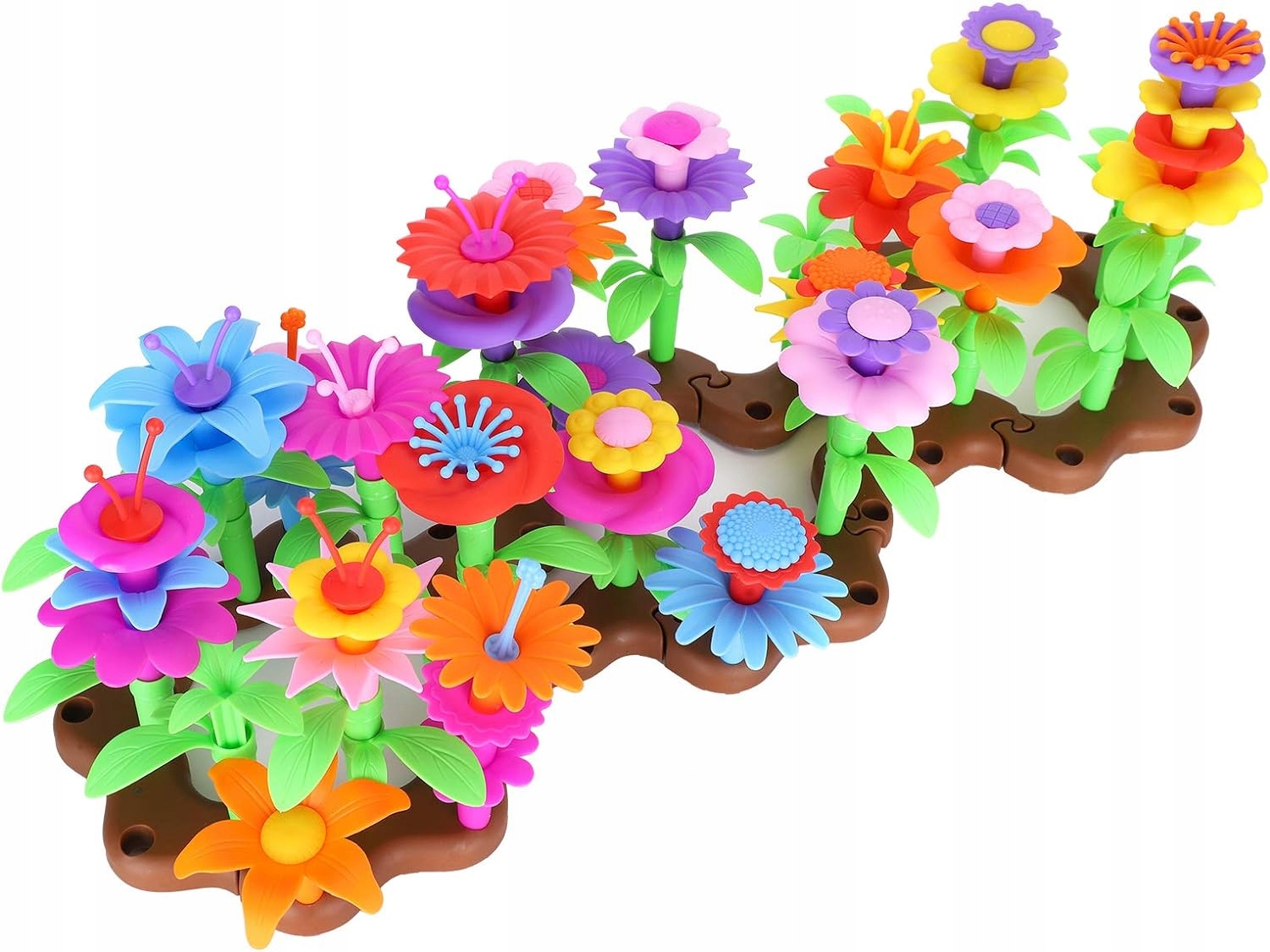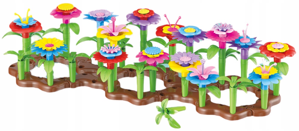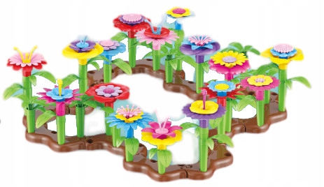 Zestaw składa się z różnorodnych elementów: podstaw, łodyżek, listków i wielobarwnych płatków kwiatów, które można dowolnie łączyć i komponować. Dzięki temu dzieci mogą tworzyć unikalne bukiety, rozłożyste rabatki czy fantazyjne ogrody, a przy tym ćwiczyć zdolności manualne i kreatywność.