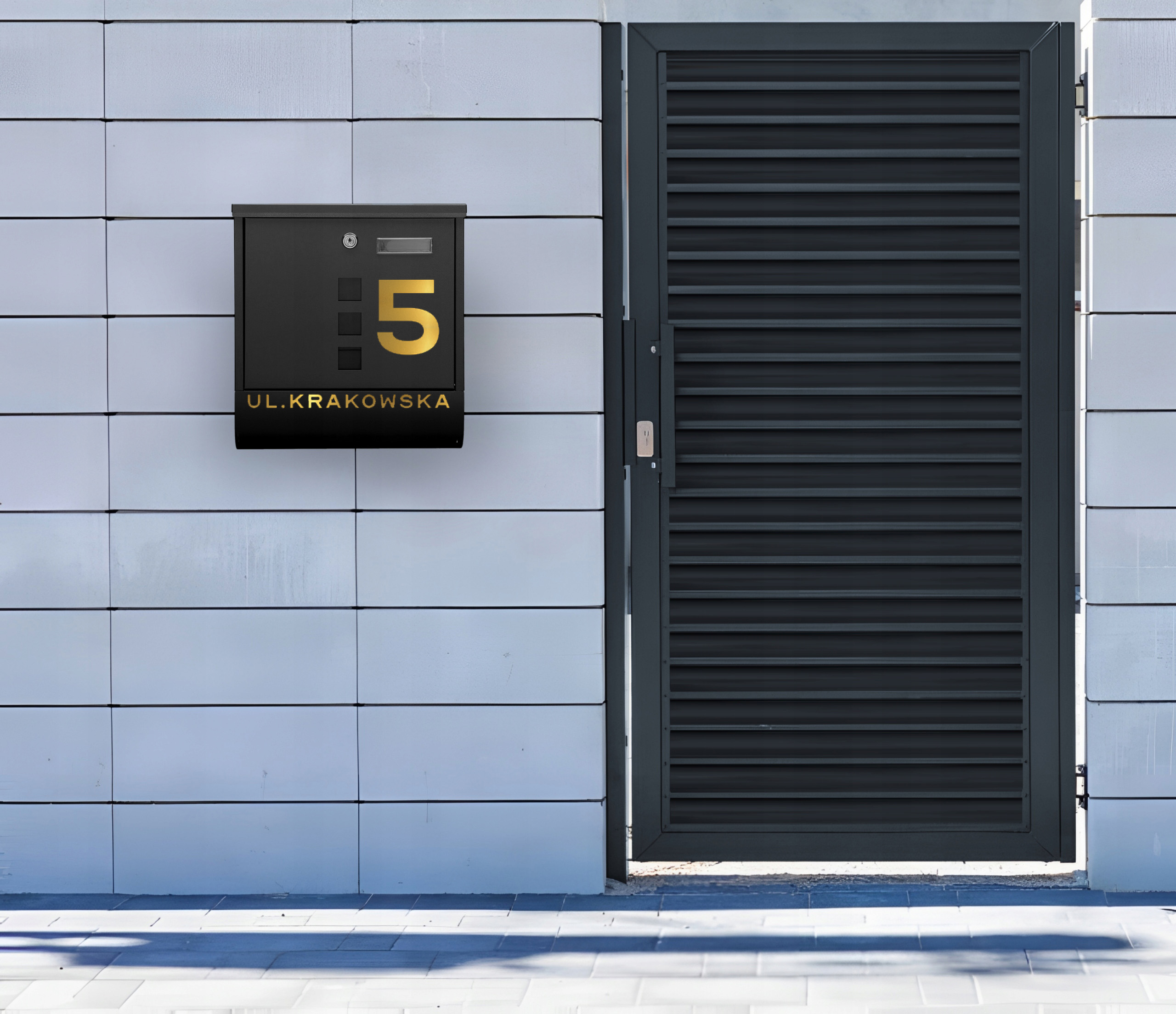 Zdjęcie przedstawia rzeczywistą skrzynkę na listy, a nie wizualizację komputerową ani render. Dzięki temu masz pewność, że kolor skrzynki oraz złotej folii dekoracyjnej wygląda dokładnie tak jak na fotografii – bez przekłamań i sztucznego podbijania barw.