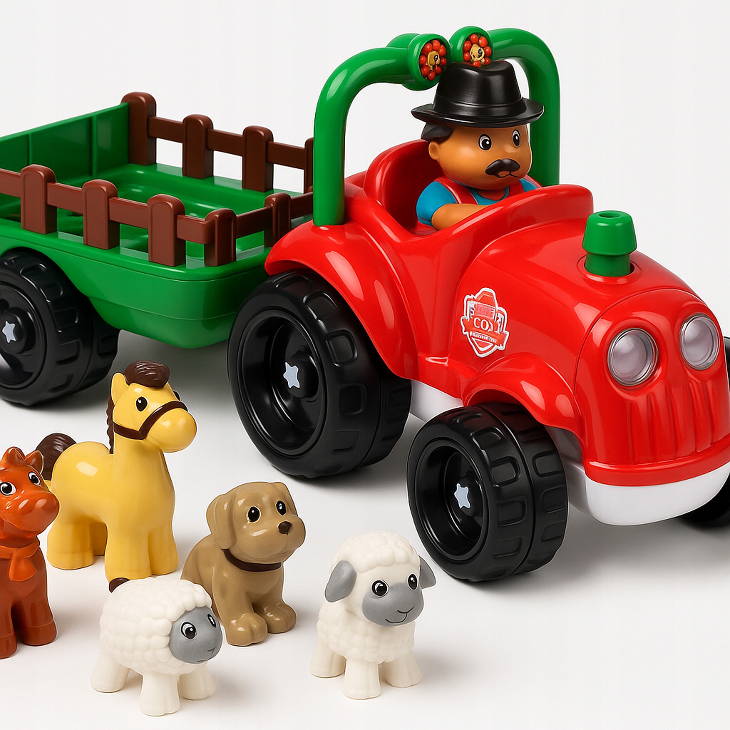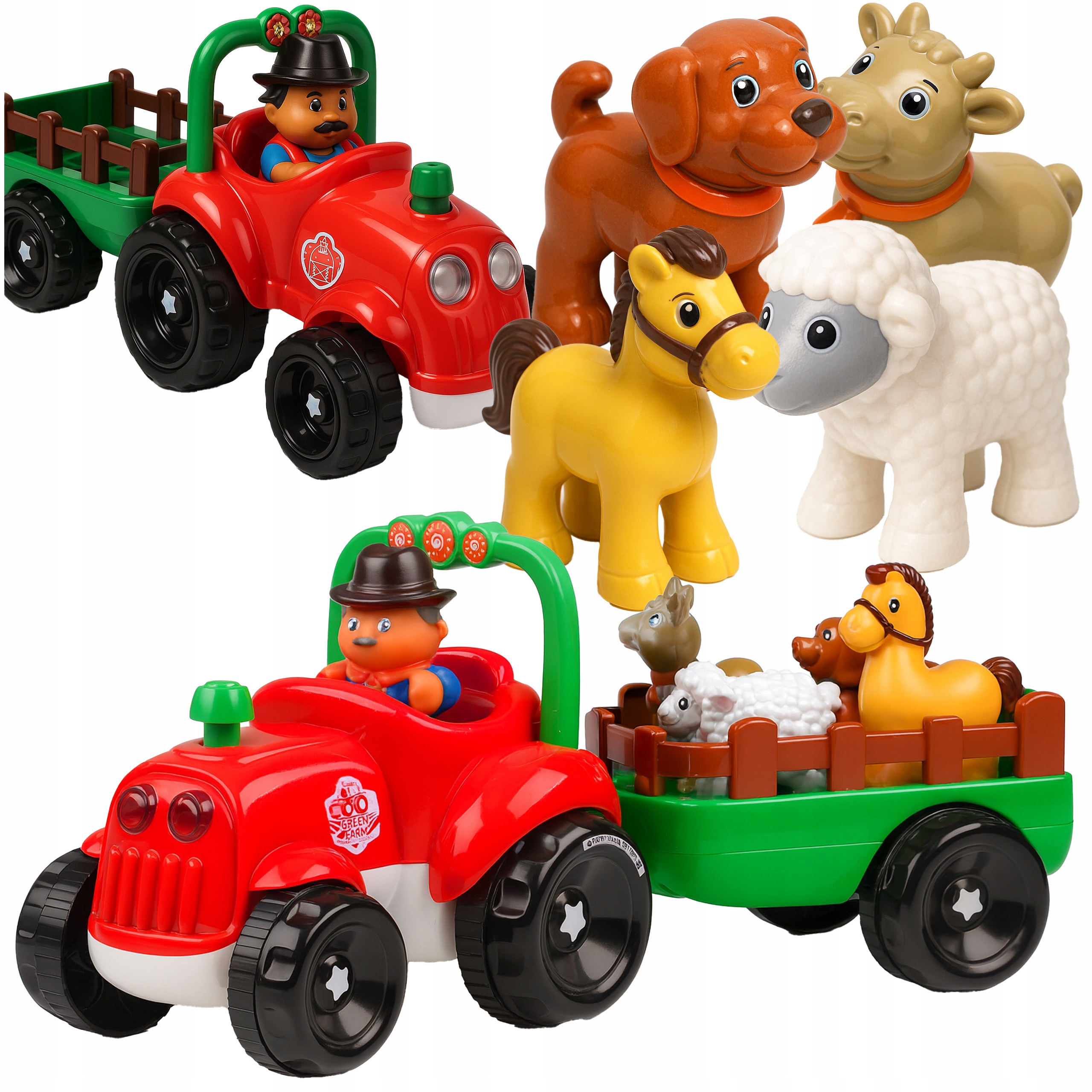 Traktor z przyczepą i figurkami farmera oraz zwierząt